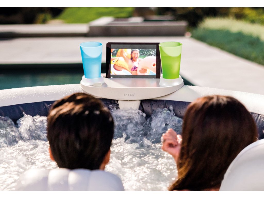 Odpočívejte při oblíbeném filmu nebo hudbě. Police pro bazén vás potěší dalším praktickým prvkem, a to zabudovaným držákem na tablet nebo mobil. Své zařízení tak můžete mít kdykoli k dispozici.