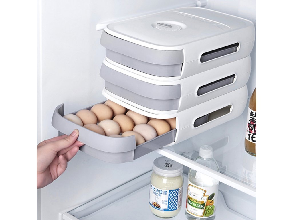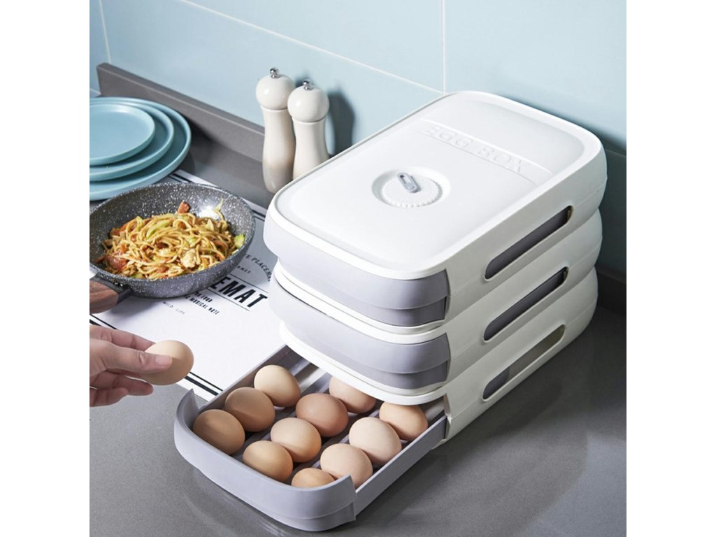 Unikátní box disponuje velkou kapacitou a umožňuje uložení až 18-20 vajec. Díky promyšlené konstrukci zásuvkového typu jsou vejce uložena ve třech řadách, což zaručuje jejich přehledné a bezpečné uskladnění.