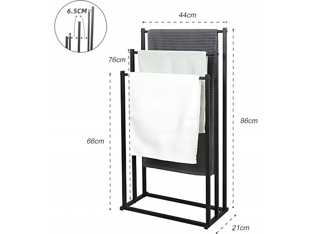 S rozměry 86 cm x 44 cm x 21 cm je stojan dostatečně velký pro uskladnění více ručníků, ale zároveň kompaktní, aby nezabíral příliš mnoho místa. Je ideálním řešením i pro menší koupelny.