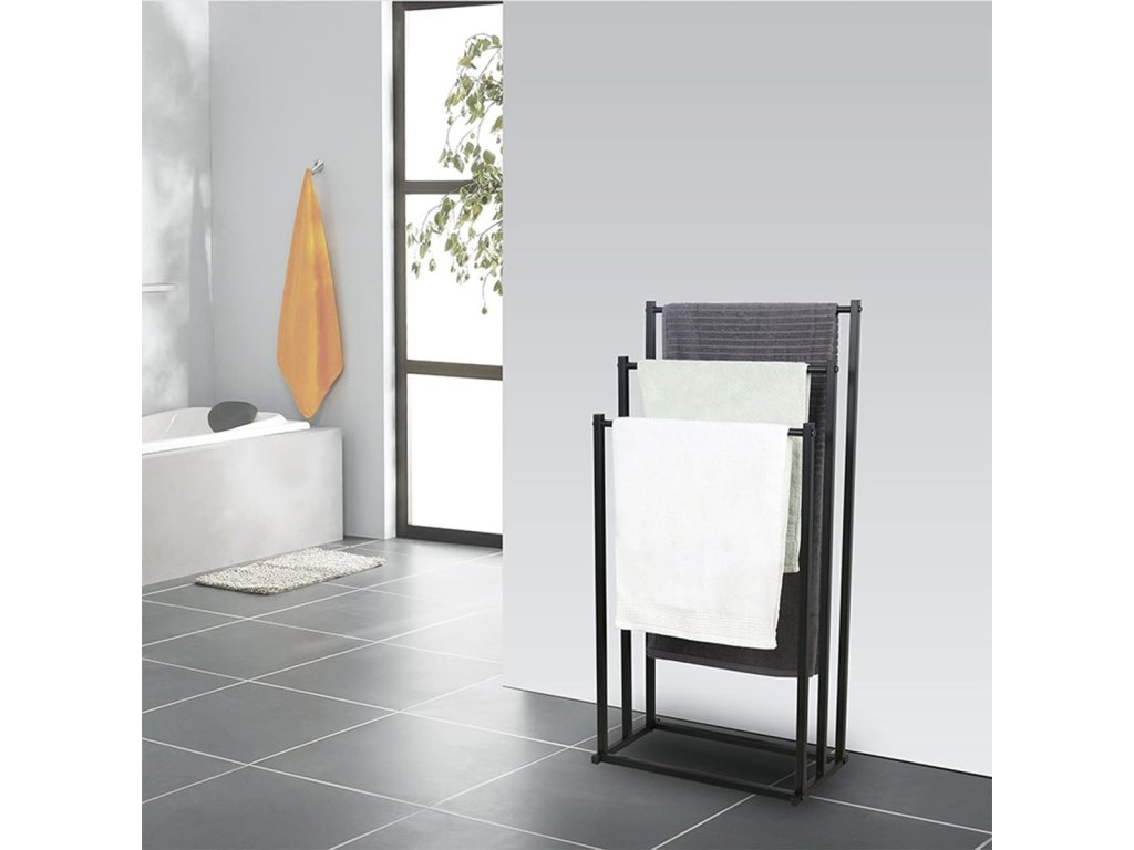 Stojan na ručníky disponuje třemi praktickými úrovněmi, které umožňují efektivní rozložení ručníků. Díky tomu máte všechny potřebné ručníky vždy po ruce, přičemž udržíte koupelnu čistou a uklizenou.