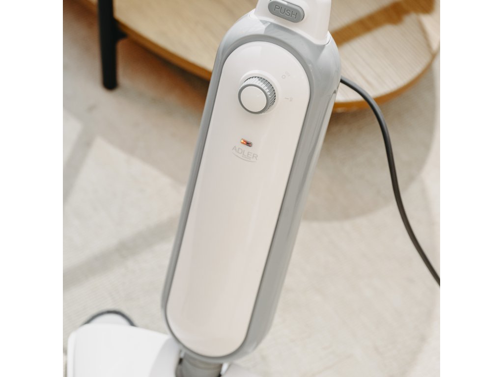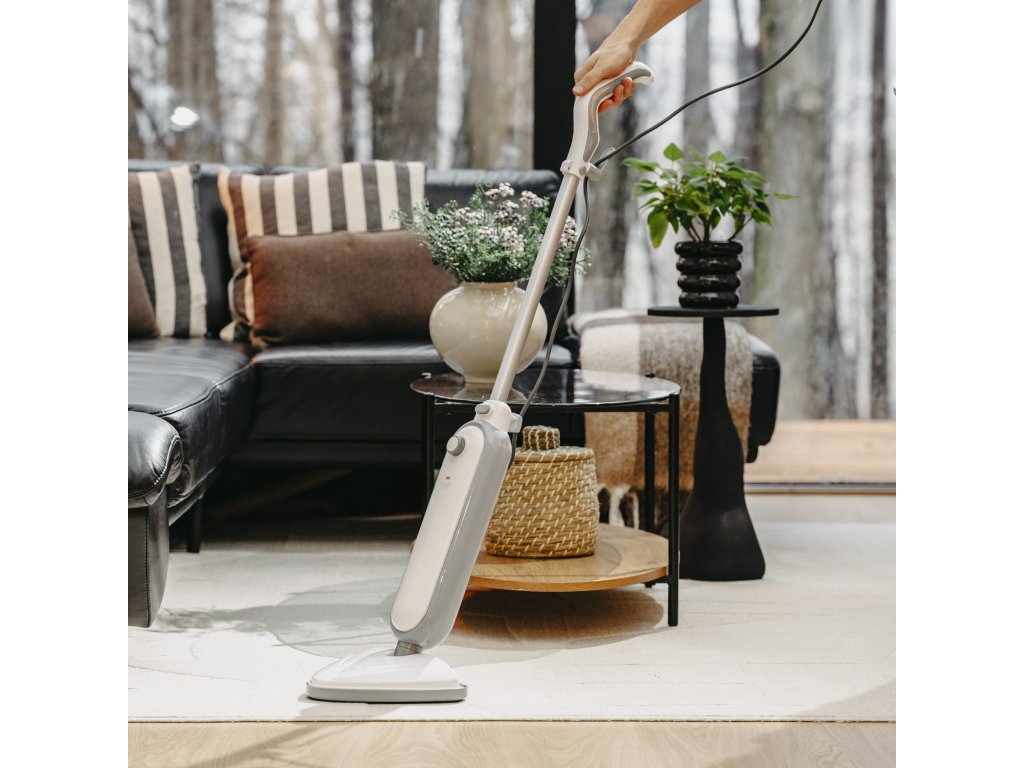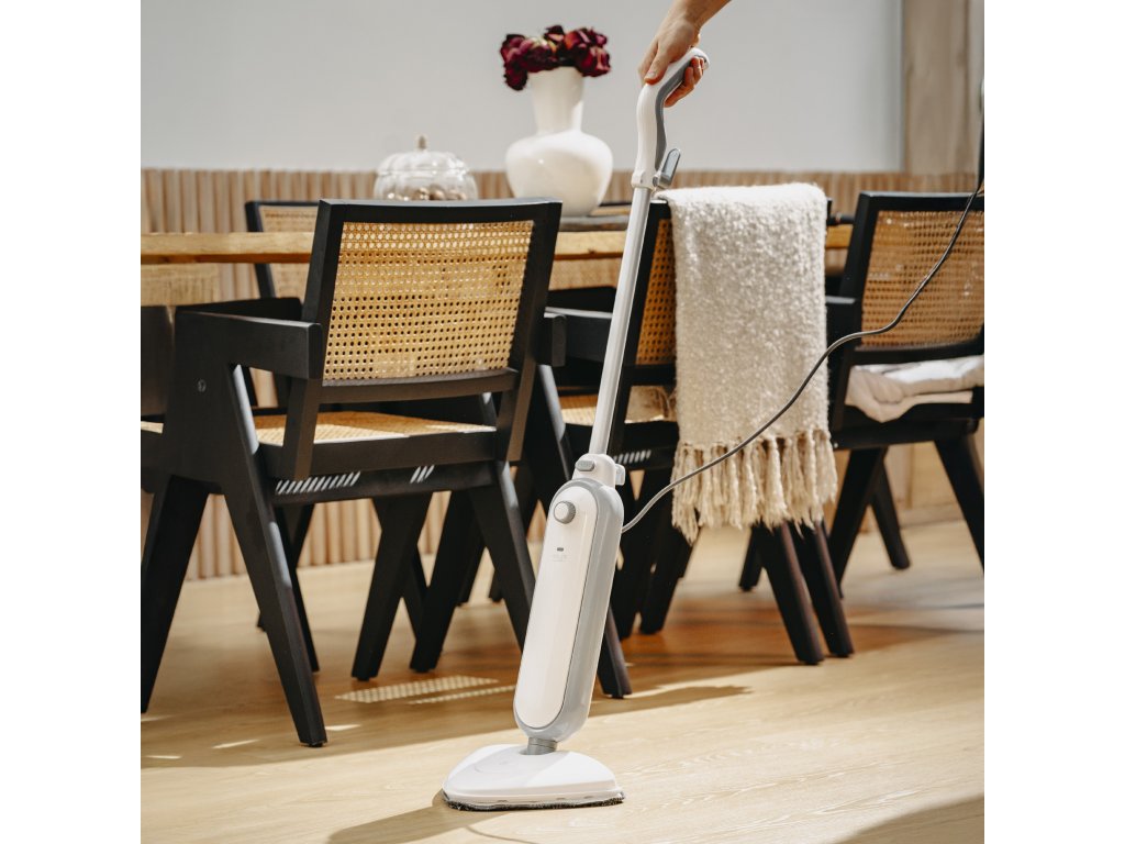 Parní mop má praktický, kompaktní a příjemný design. Nyní můžete snadno umýt všechna těžko dostupná místa. podlahu pod stolem nebo komodu.