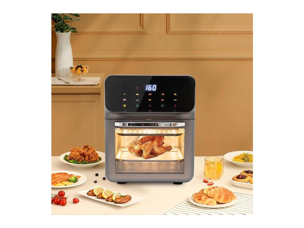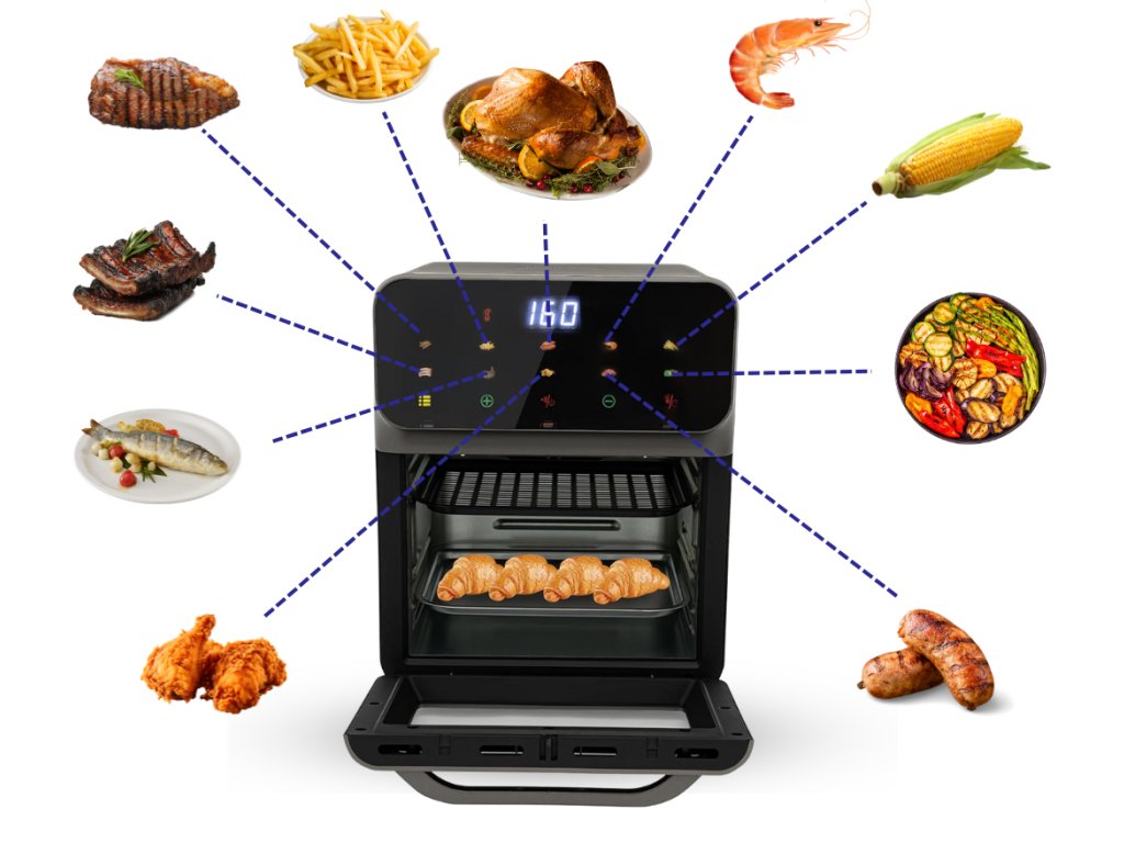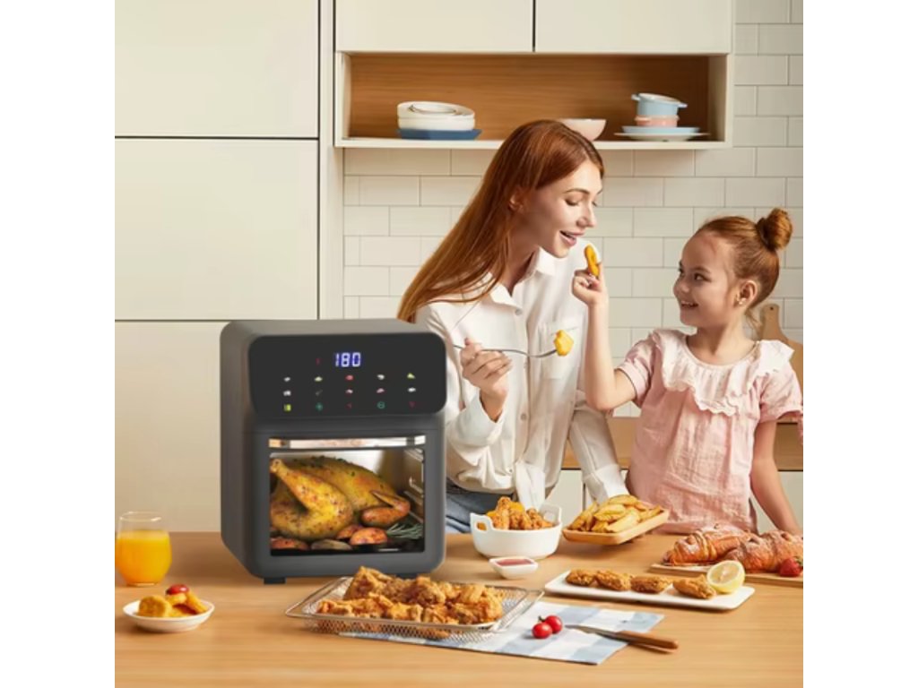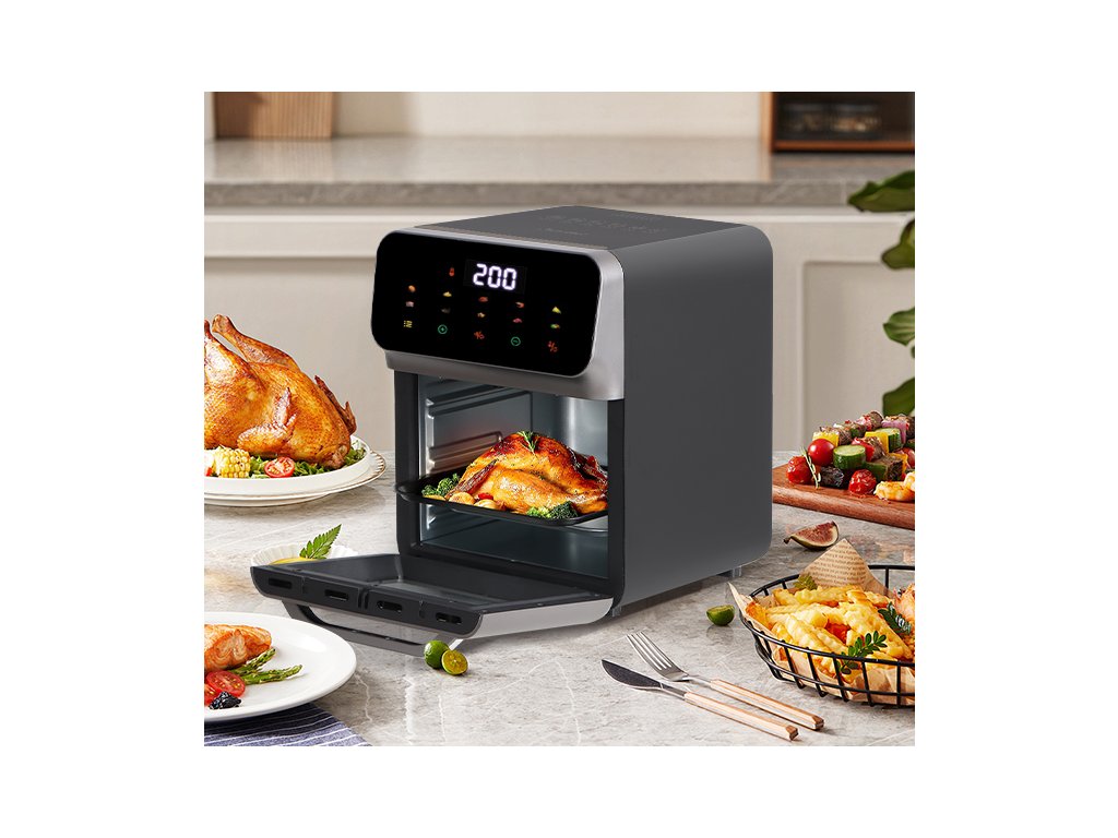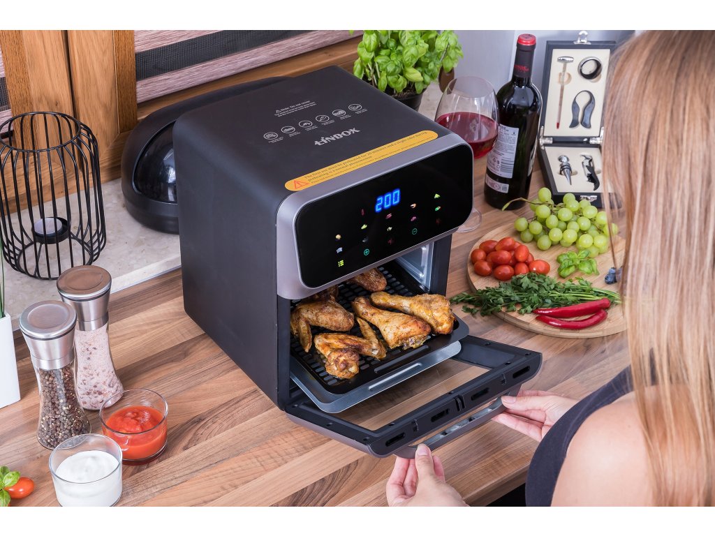 Tato vynikající mini trouba – horkovzdušná fritéza s dotykovým displejem je vybavena vším, co potřebujete k dokonalému pečení. Nastavitelná teplota a časovač vám umožní připravit rozličné druhy jídel – od křupavého chleba po lahodné koláče.