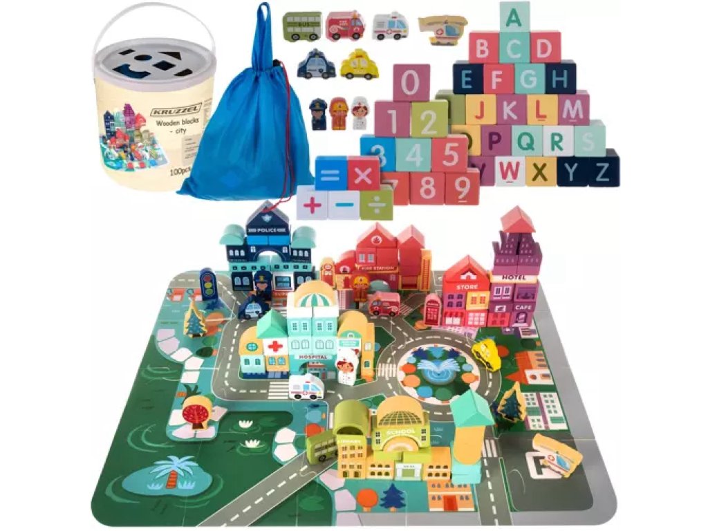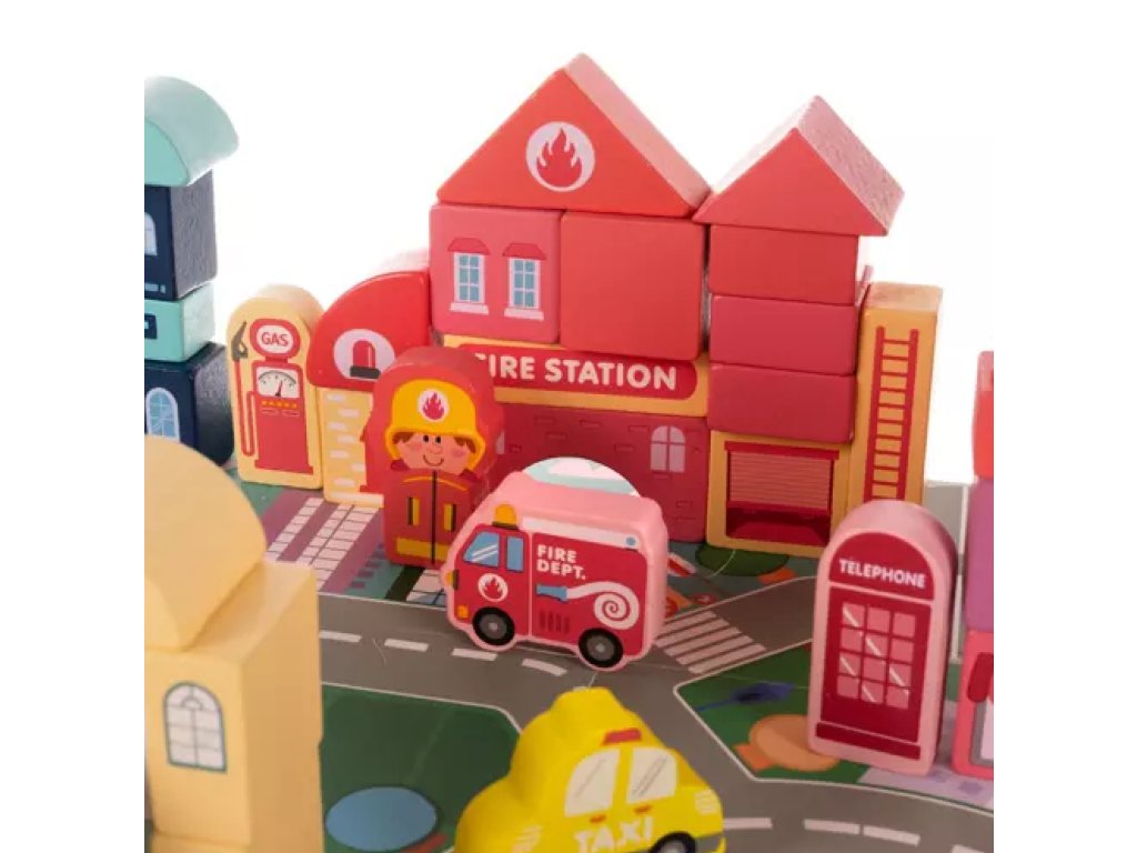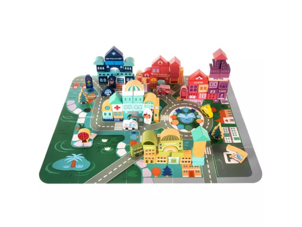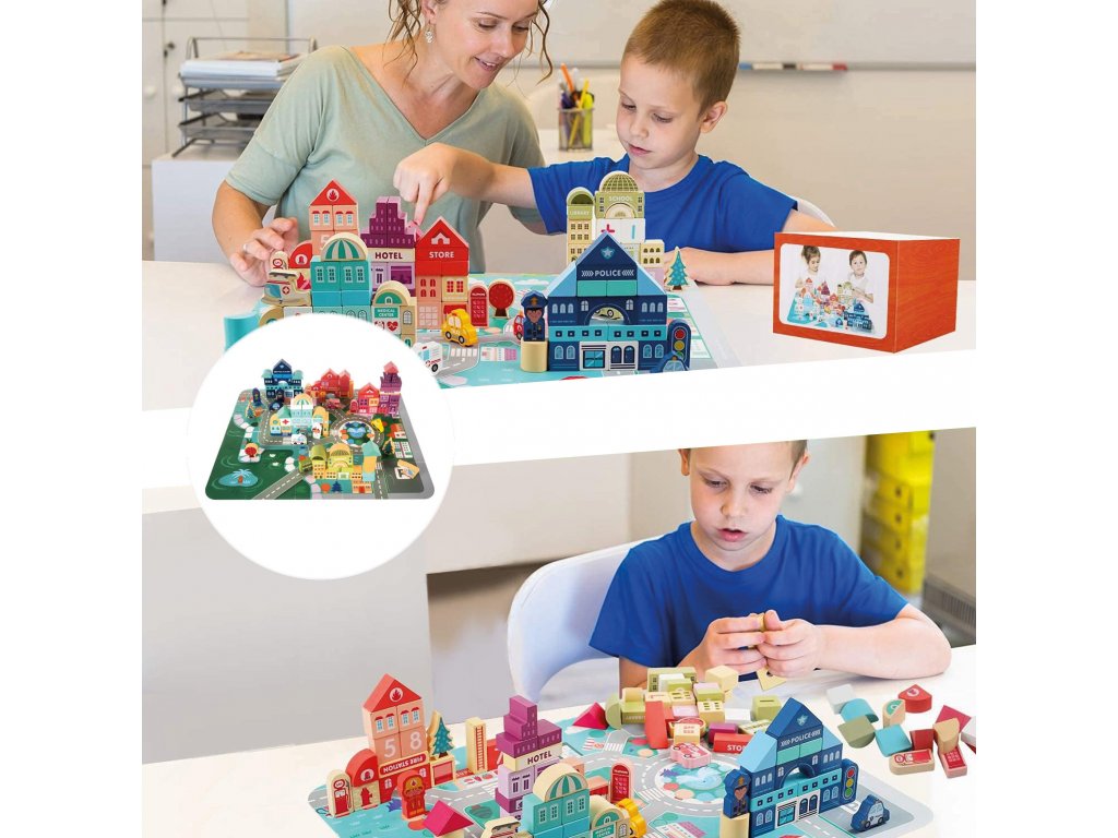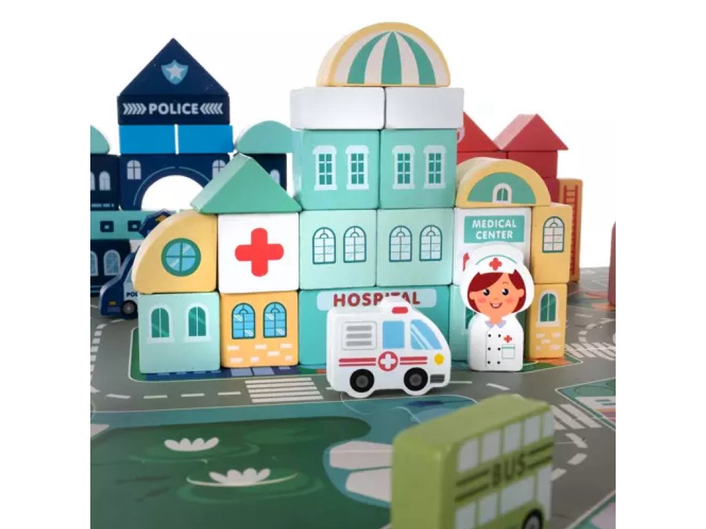 Jedinečné dřevěné kostky Město jsou stvořeny pro kreativní duše dětí. Vaše děti budou moci vytvářet různé druhy staveb, od banky až po nemocnici. Je to hračka, která není jen zábavná, ale i vzdělávací.