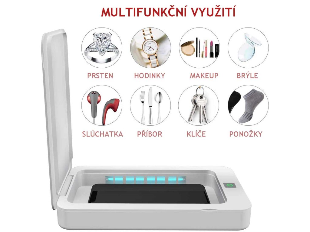 Toto zařízení má multifunkční využití. Kromě mobilních telefonů v něm můžete dokonale dezinfikovat i různé malé předměty jako jsou klíče, brýle, ovladače, hodinky, hračky, dudlíky, šperky, sluchátka, mp3 přehrávače, zubní kartáčky a různé jiné předměty.